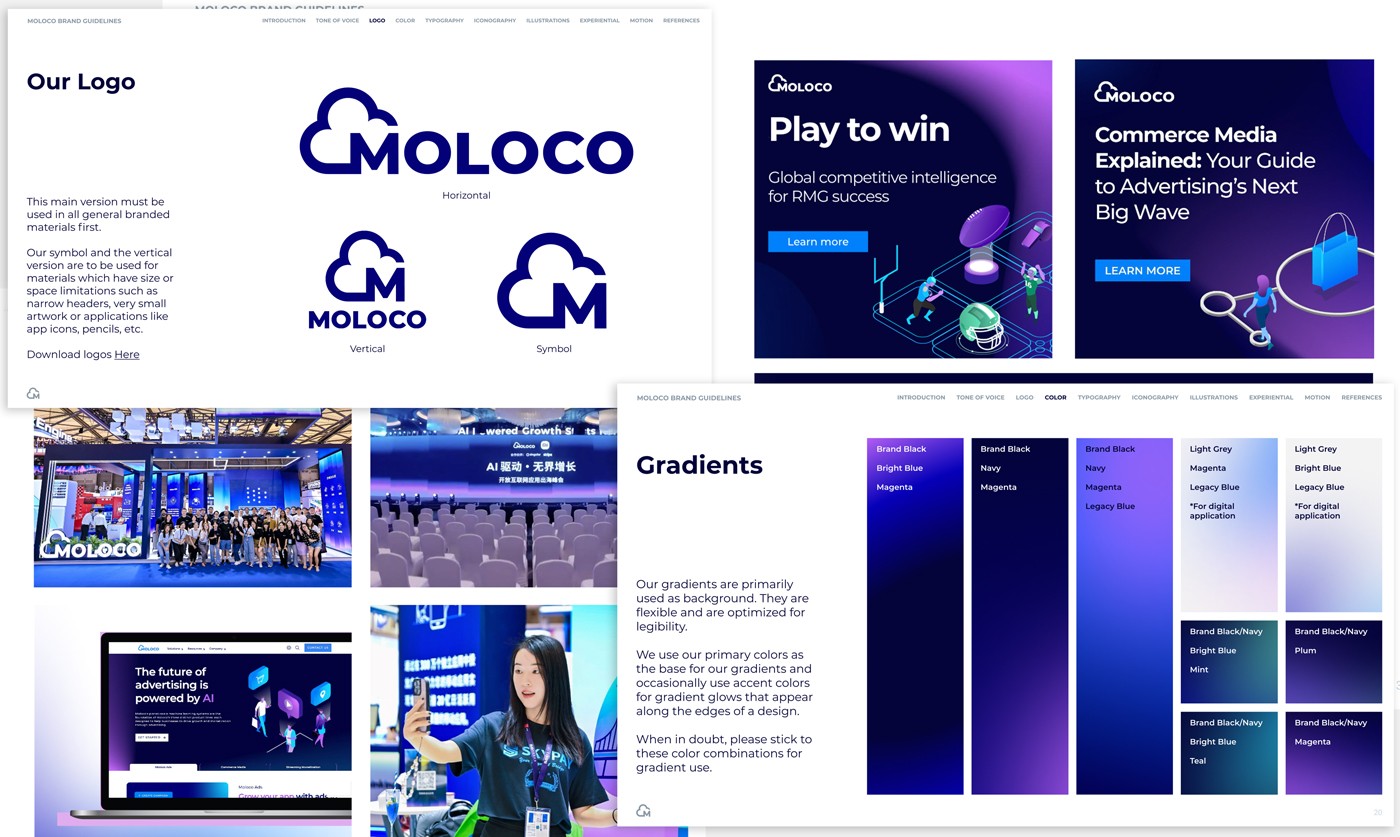 While partnering with Moloco we created a set of brand guidelines to create clarity for the company and to serve as a compass that assures the brand will remain consistent visually, in messaging and tone, and across all touch points.